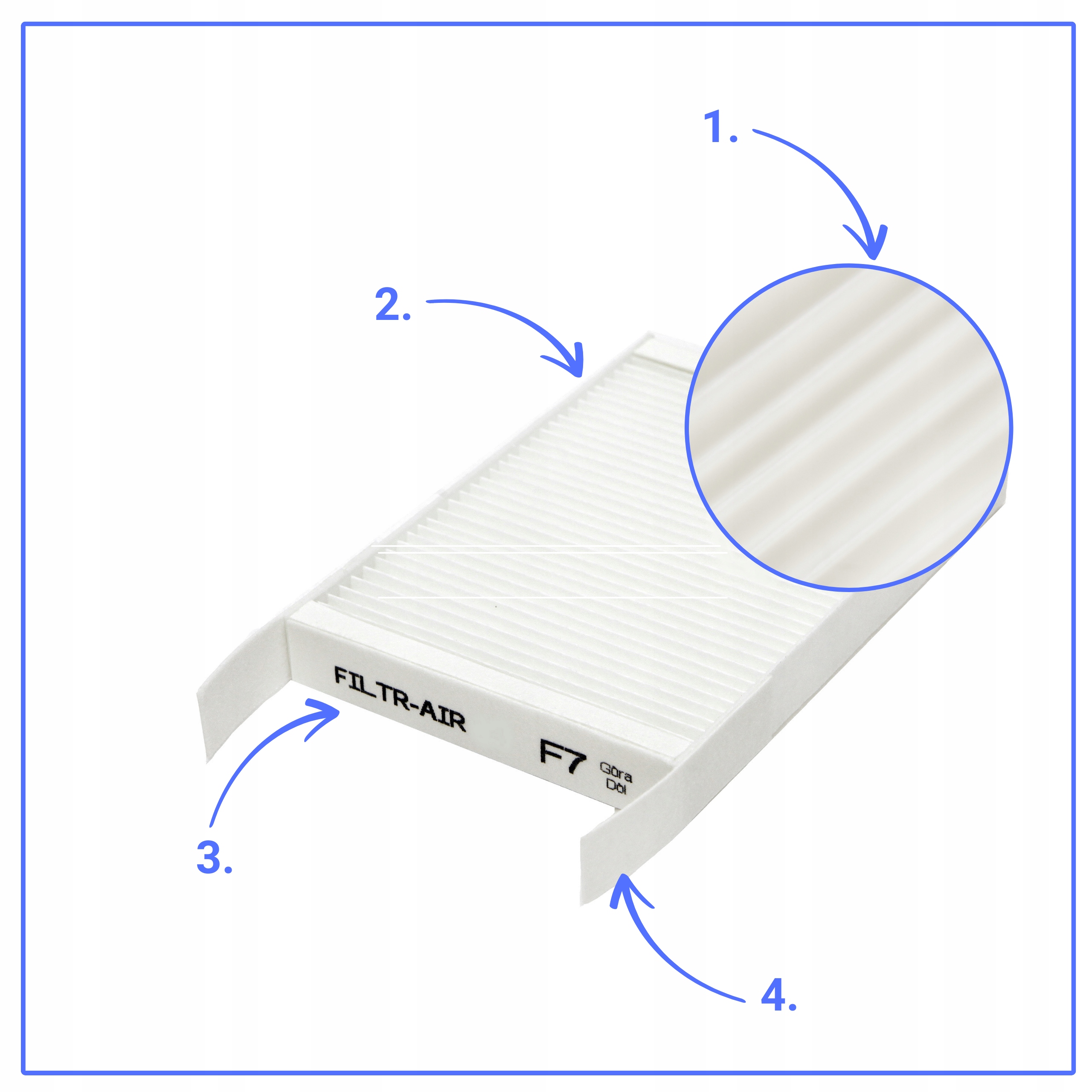 Filtr F7 do rekuperatora Zehnder ComfoSpot 50 zapewnia wysoką skuteczność w oczyszczaniu powietrza z alergenów i kurzu, posiadając powierzchnię filtracyjną około 1300 cm2 i trwałą ramkę z poliestru.