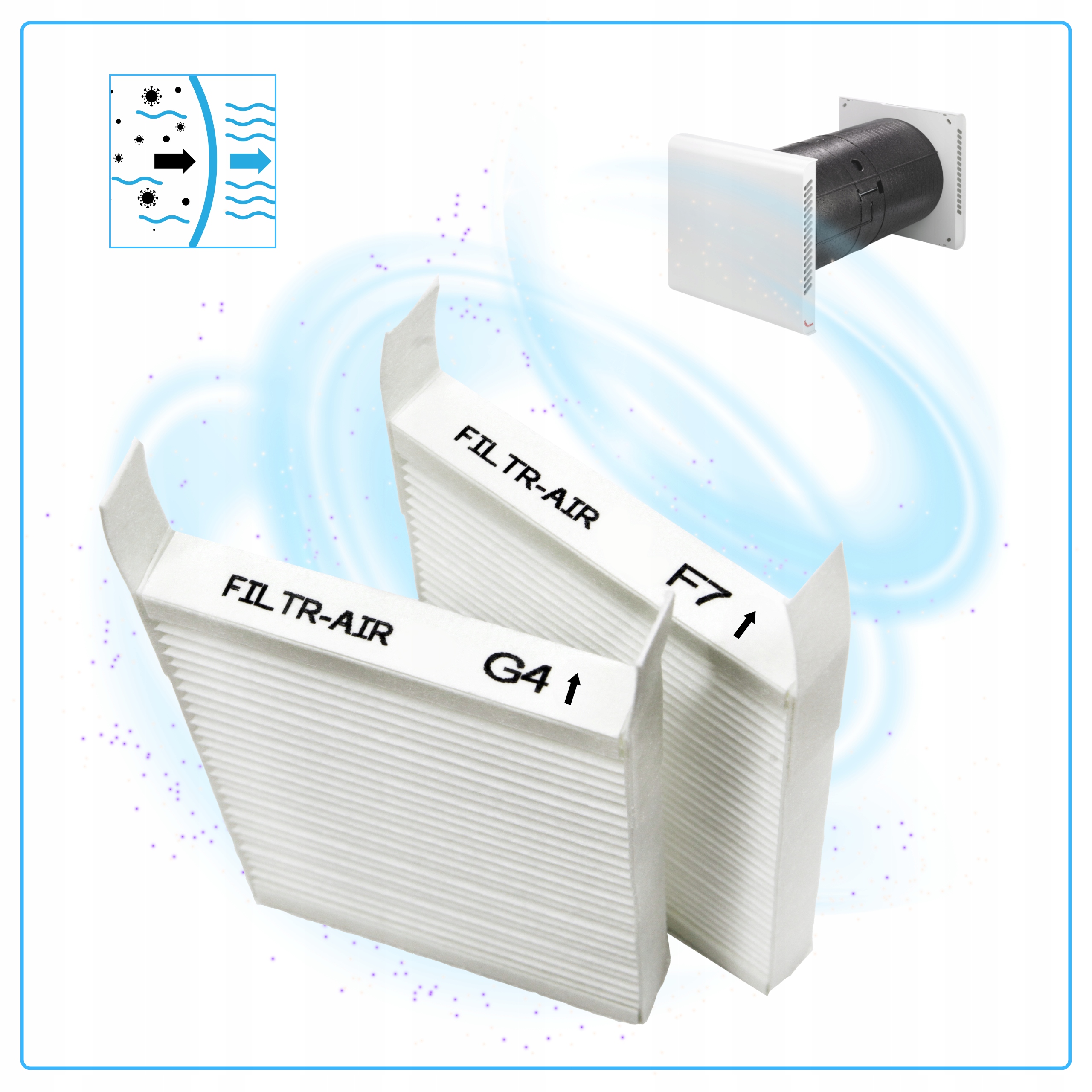 Filtr powietrza G4 i F7 do rekuperatora Zehnder ComfoSpot 50, skutecznie oczyszczający powietrze, zawiera dwa filtry wstępne G4 oraz dwa filtry główne F7.