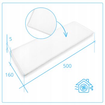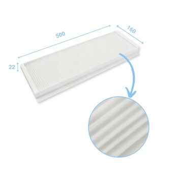 - Wymiary filtra: Długość: 500 mm, Szerokość: 160 mm, Wysokość: 22 mm
