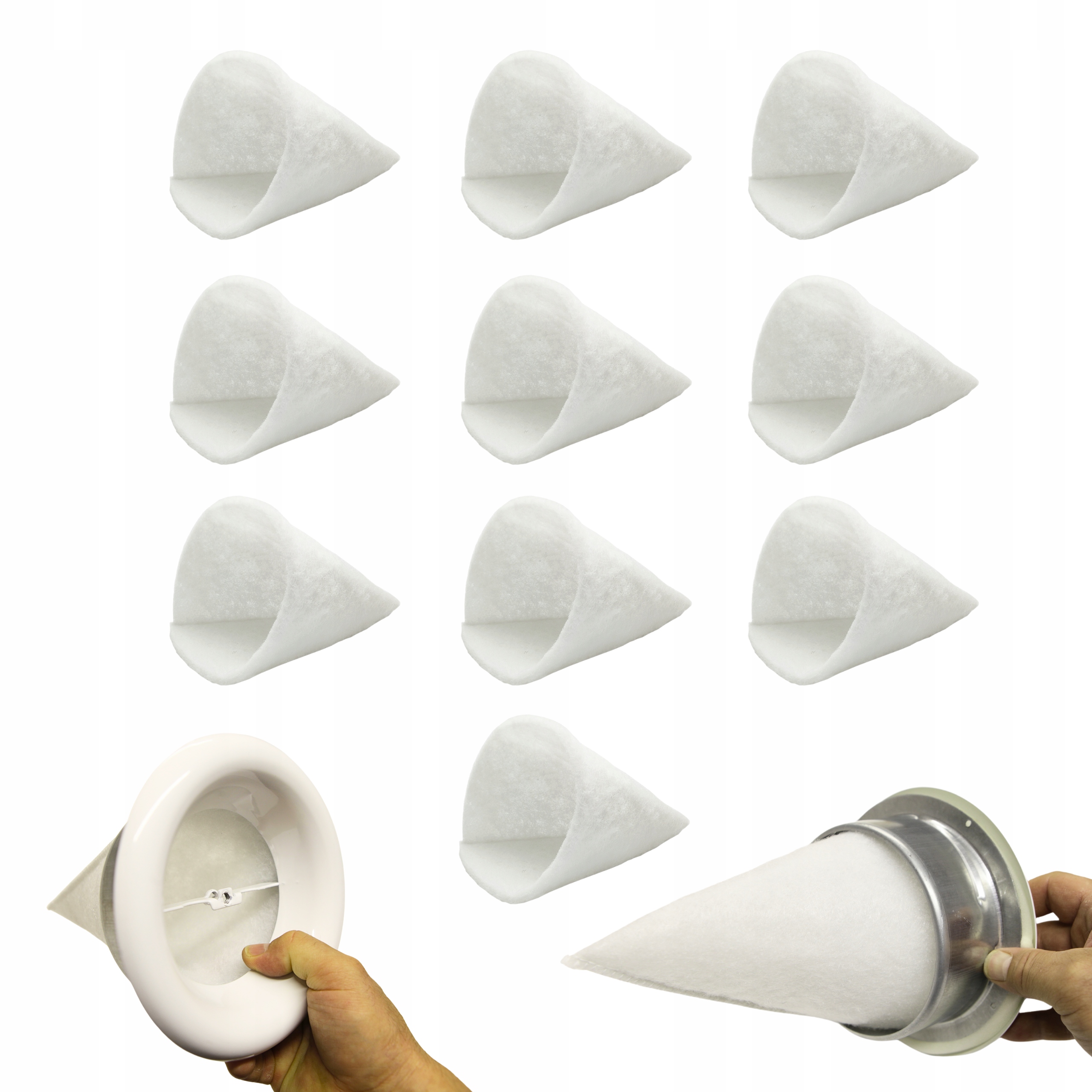 Filtr stożkowy 100 mm do anemostatów okrągłych, skutecznie zatrzymujący zanieczyszczenia. Zestaw zawiera 10 sztuk filtrów wykonanych z trwałej tkaniny poliesterowej.