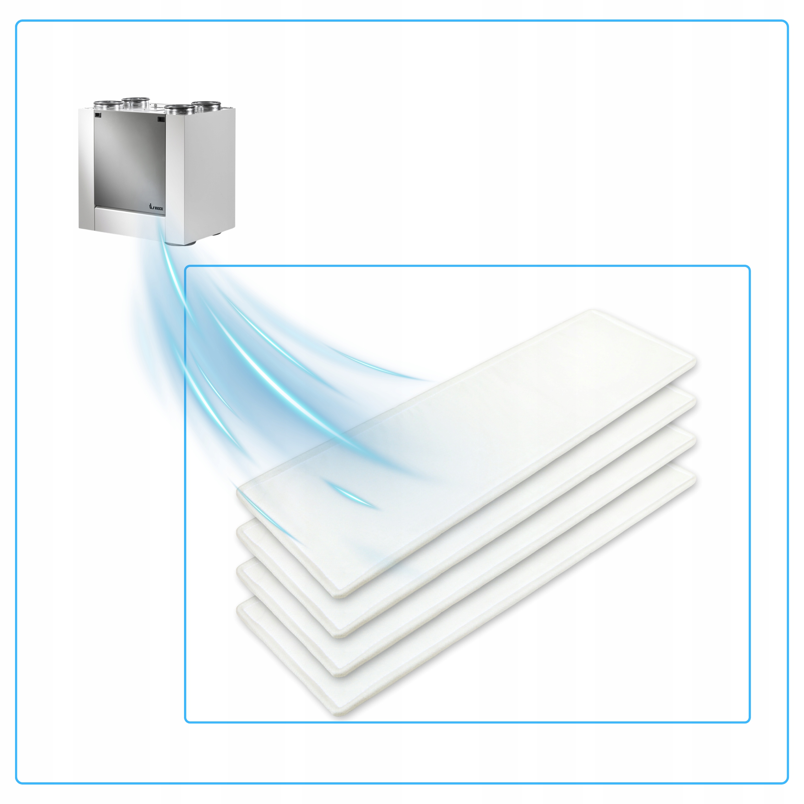 Filtry powietrza F7 do rekuperatorów Vasco są wysokiej jakości zamiennikami, które zapewniają skuteczną filtrację powietrza, współpracując z modelami X350, X450 i X500.