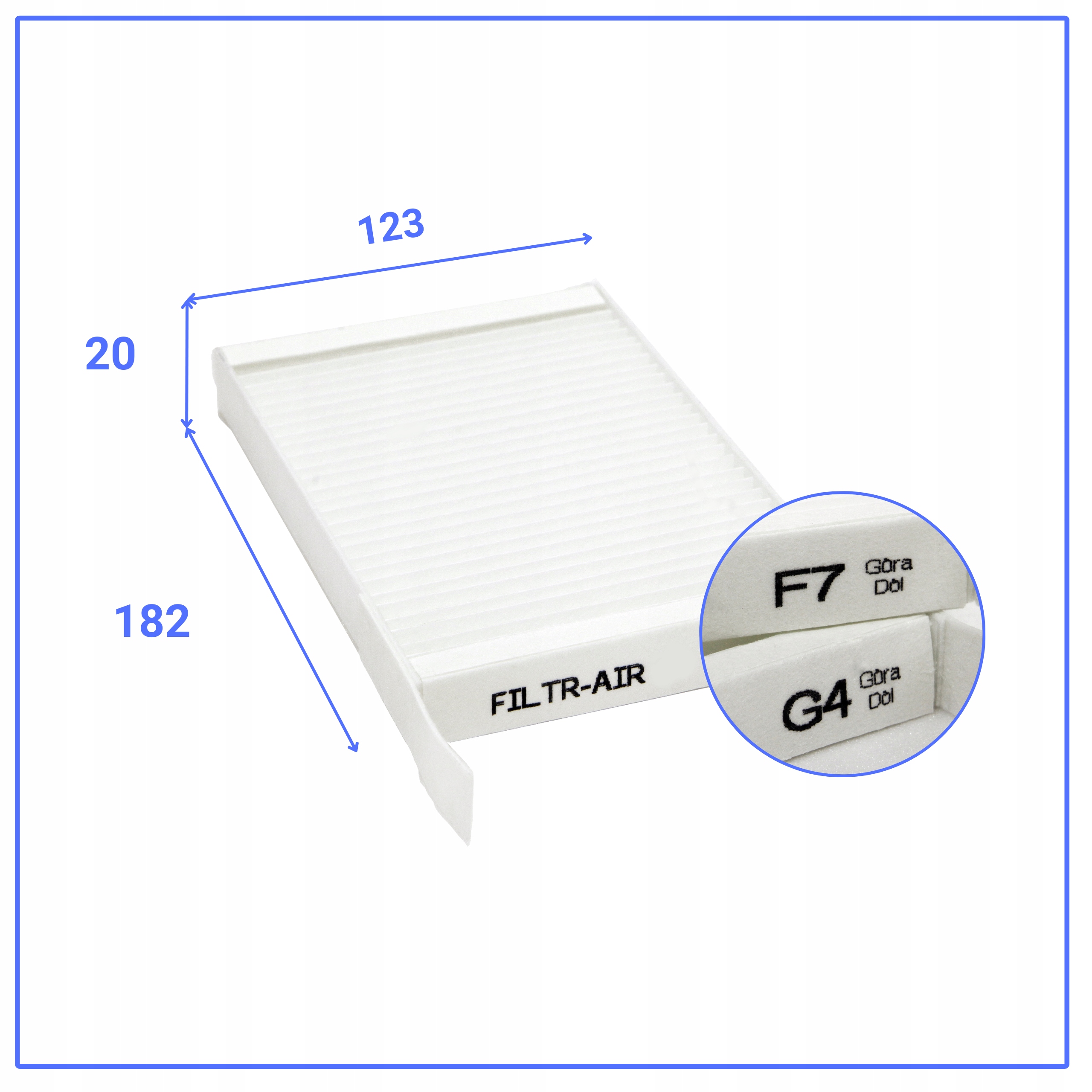 Filtr powietrza G4 o wymiarach 500 x 200 mm, kompatybilny z wieloma modelami rekuperatorów Aeris i Zehnder, zapewnia efektywną filtrację podstawowych zanieczyszczeń.